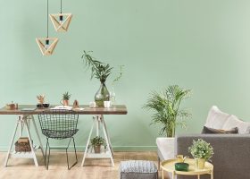 The Colour Revelation catalogue features other more vibrant shades, such as Turmeric #E720, Into the Blue #E696, Caribbean #E705 or Mustard #E714, which should be applied in small doses (edges, prints or drawings) with joyful details without going over the top. If we are colour lovers and want to give our workspace a different touch, then we should go for powdered or pastel shades, like the colour of the year Pink Oyster # E735, the new Light Blue # E739 or Olive # E737. In this way we can paint half a wall or create, for example, a geometric wall, always combining with a neutral tone to avoid excessive stimuli.