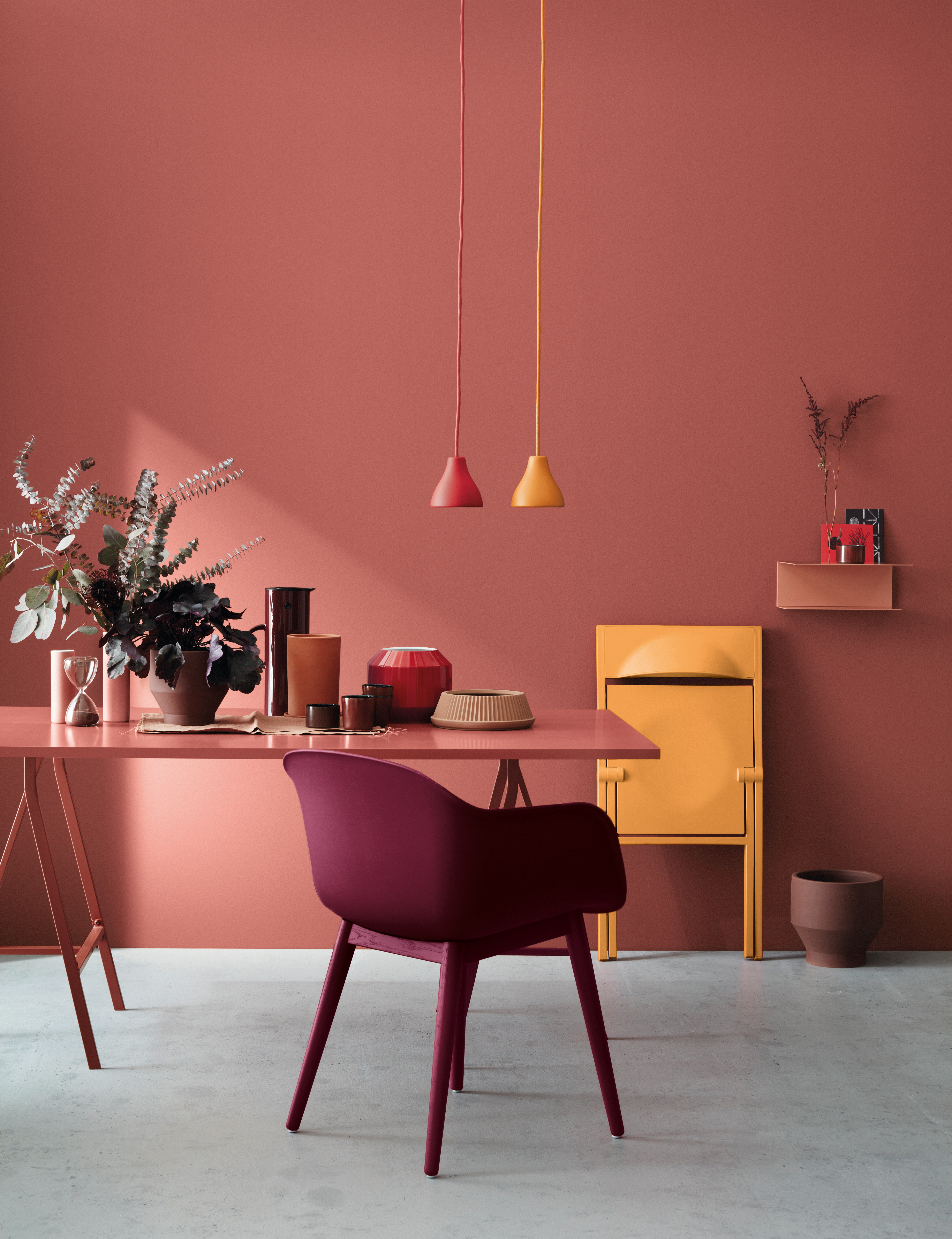 The Colour Revelation catalogue features other more vibrant shades, such as Turmeric #E720, Into the Blue #E696, Caribbean #E705 or Mustard #E714, which should be applied in small doses (edges, prints or drawings) with joyful details without going over the top. If we are colour lovers and want to give our workspace a different touch, then we should go for powdered or pastel shades, like the colour of the year Pink Oyster # E735, the new Light Blue # E739 or Olive # E737. In this way we can paint half a wall or create, for example, a geometric wall, always combining with a neutral tone to avoid excessive stimuli.